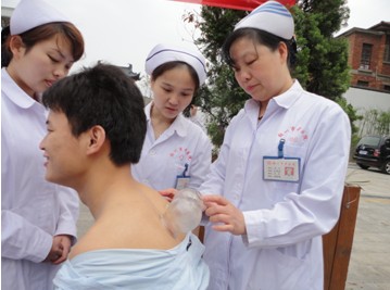 在活動中,醫護人員分成兩組,其中由10名護理人員組成的慰問小組深入到5戶社區困難家庭提供免費醫療服務,并送去慰問金200元、免費藥品(我院自制的清熱止癢散)及健康科普宣傳資料等,病人和家屬表示能在家里享受如此貼心的醫療服務非常感謝。另一組在郁孤臺四賢坊廣場上為群眾提供義診服務,現場演示心肺復蘇,指導群眾心肺復蘇急救技能知識,為群眾免費進行艾灸、拔火罐和扎針灸等中醫護理技術操作,并發放健康科普宣傳資料。